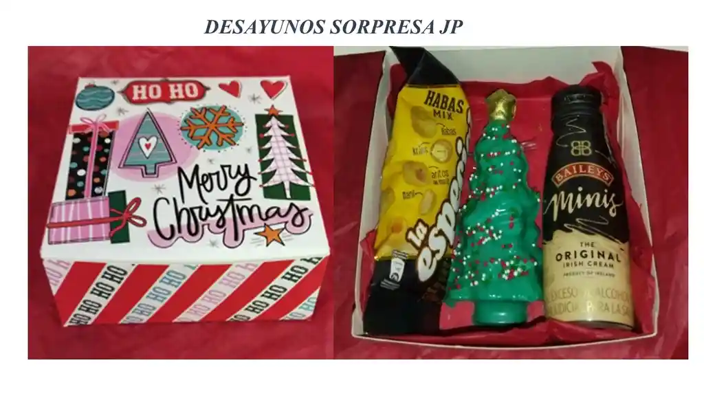Sorprende con este bonito detalle en navidad que contiene: Mini Baileys x 100 ML Chocolate en forma de Arbolito de navidad Maní Masmelo Caja decorativa de Navidad Tarjeta con mensajito de Feliz Navidad