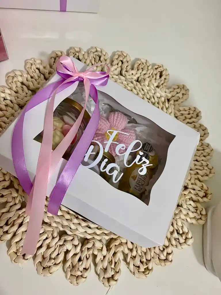 Frasco grande con gomitas y Masmelos, llavero en crochet en forma de flor, frutos secos, Trío de Ferrero, tarjeta Feliz Día.