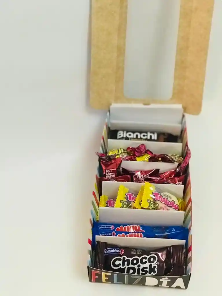 Caja de cartón con diseño de feliz día1 Bianchi 3 Burbujas Jet6 Chocoball4 Gomistas Trululú dona2 Muu1 Chocodisk