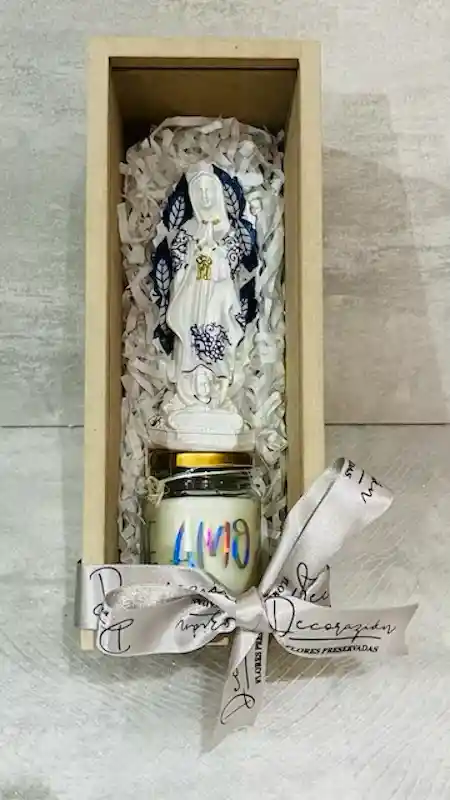 Caja de mdf con virgen de 14 cm en su interior, decorada en la técnica decoupage y una velita aromatizada. Viene con la tapa marcada Te Amo Mamá. Incluye tarjeta.