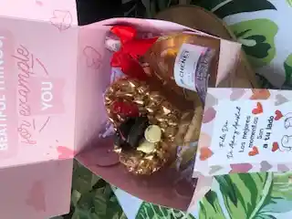 torta de brownie con areqipe decorada con toppings , botella mini de jp chenet caja decorada y tarjeta