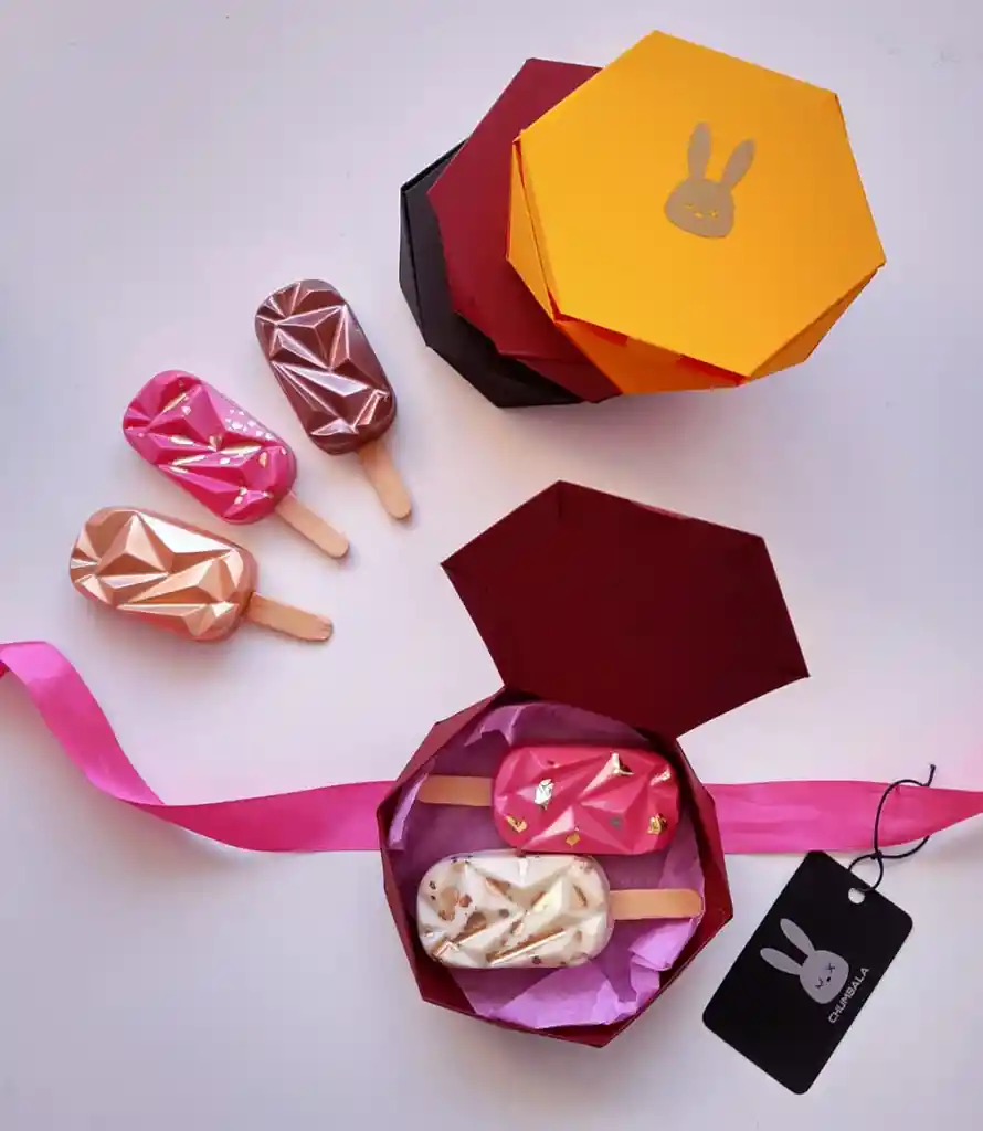 box con 2 cake slice rellenos de brownie melcochudo, cubiertos con chocolate negro y blanco. Incluye tarjeta de mensaje.