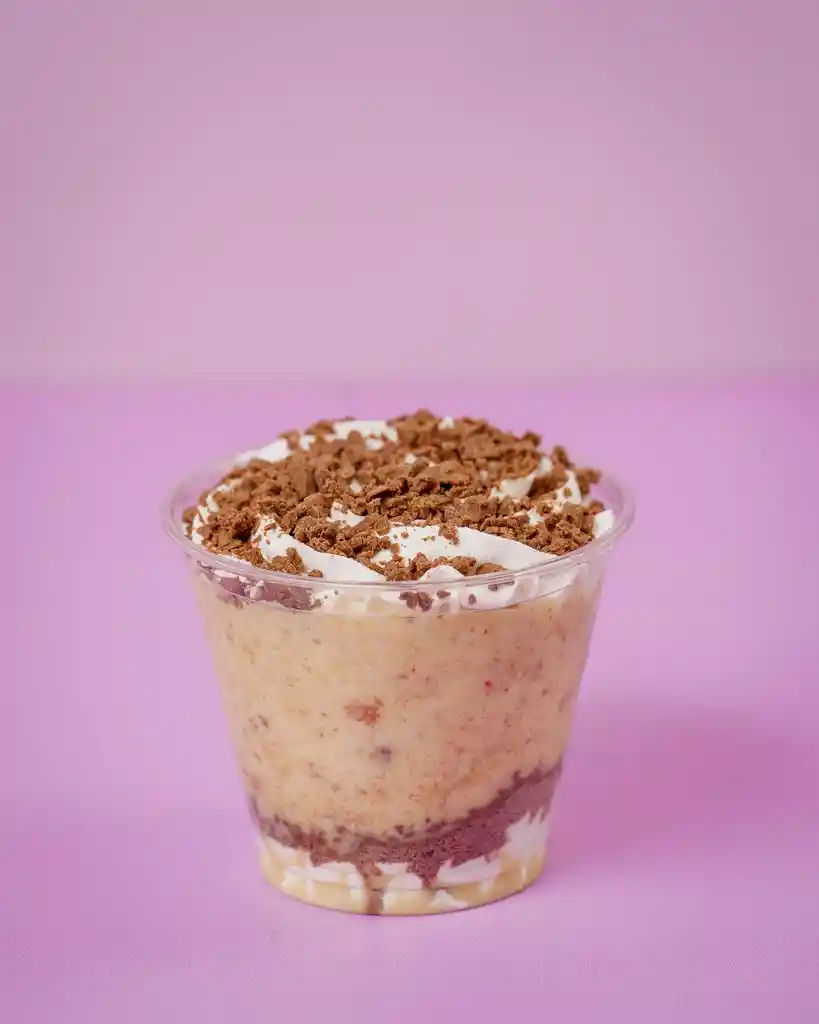 Vaso con capas de torta remojada en tres leches, chantilly y trozos de chocolate semi-amargo