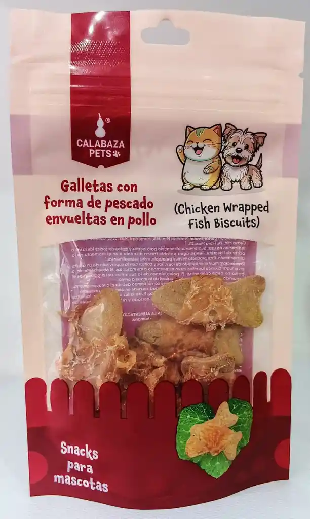 Premio para perros y gatos adultos de todas las razas, con forma de pescado envueltos en pollo, sirve como suplemento alimenticio. Producto con fecha de vencimiento vigente.