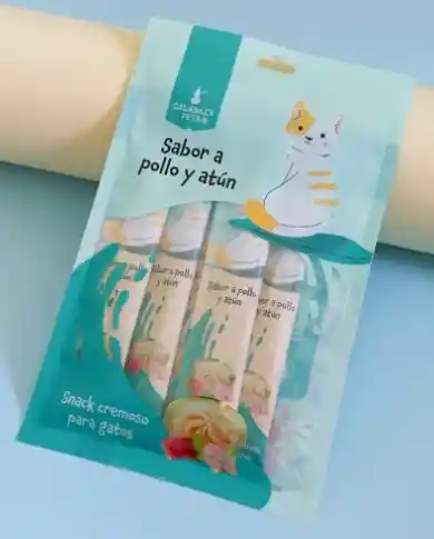 Snacks cremosos para gatos con sabor a pollo y atún. Producto con fecha de vencimiento vigente.