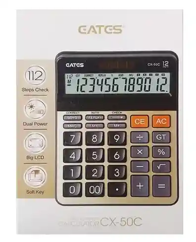 Calculadora 12 Digitos Grande (medidas 22cm x 13cm) Eates CX50C. Modo de alimentación dual (energia solar y bateria), pantalla amplia LCD reclinada, funcion de correcion y Grand Total, panel de aluminio, saca porcentajes. Excelente material resistente y bonito diseño