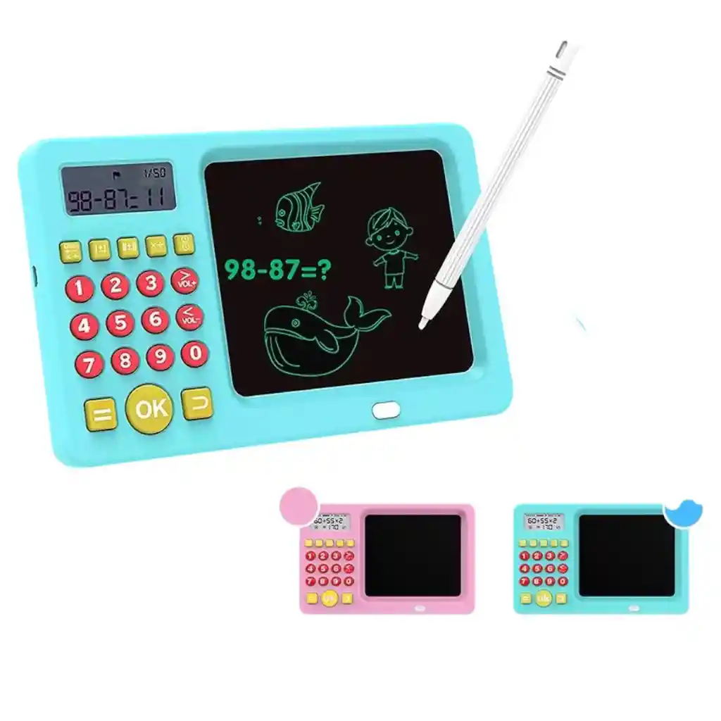 Dispositivo educativo multifuncional ideal para niños en etapa escolar. Combina una calculadora básica con una pizarra de escritura LCD, permitiendo resolver operaciones matemáticas y practicar escritura o dibujo de forma divertida y reutilizable.