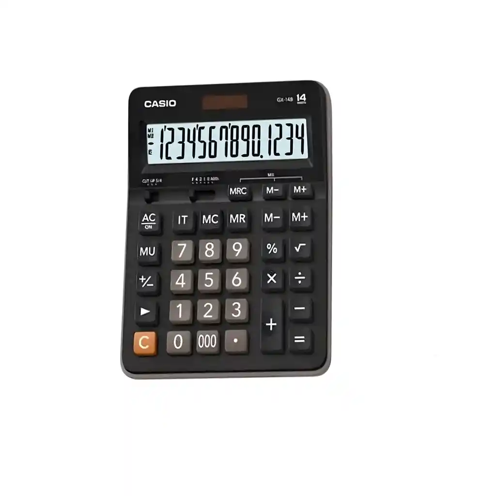 Casio GX-14B con pantalla de 14 dígitos, doble memoria y energía solar. Ideal para oficina, cálculos contables y uso prolongado.