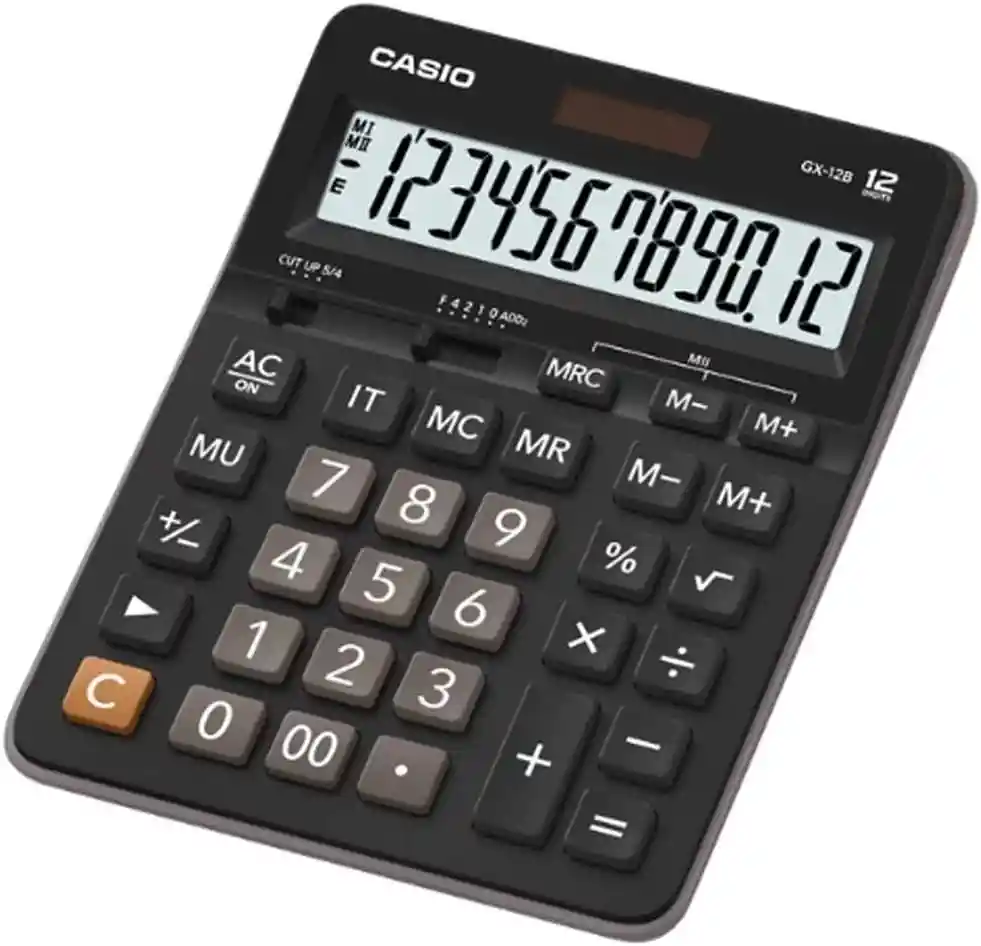 Calculadora de escritorio Casio GX-12B es un dispositivo esencial para cualquier oficina o entorno de trabajo. Elegante diseño en color negro. Esta calculadora no solo es funcional, sino también estéticamente agradable, lo que la convierte en una adición elegante a cualquier escritorio. La marca Casio es reconocida mundialmente por su calidad y durabilidad, y este modelo no es la excepción. Cuenta con una pantalla de 12 dígitos, lo que la hace perfecta para realizar cálculos largos y complicados. Además, tiene la capacidad de realizar cálculos de porcentaje regular, una función esencial para cualquier negocio o tarea financiera. A pesar de su amplia gama de funciones, la Casio GX-12B es increíblemente fácil de usar. No cuenta con impresora, lo que la hace más compacta y portátil. Pertenece a la línea de productos de oficina de Casio, diseñada específicamente para satisfacer las necesidades de los profesionales modernos. En resumen, la Calculadora de Escritorio Casio GX-12B es una herramienta confiable y versátil que no debe faltar en ningún escritorio. CARACTERISTICAS Marca: Casio Línea: Escritorio Modelo: GX-12B Modelo alfanumérico: GX-12B Color: Negro Peso:245 g Altura x Ancho: 20.75 cm x 15.9 cm Otros: Cantidad de dígitos 12 Tipo de calculadora: Escritorio Cantidad de funciones: 1 Funciones: Escritorio Con impresora: No Tipo de alimentación: Solar/Pila LISTA DE EMBALAJE: 1* Calculadora CASIO GX12B 1* Manual 1*Pila incluida (Interna) GARANTÍA: La garantía del producto es de 30 días contados a partir de la fecha de entrega. Recuerde este equipo es para uso hogar/ ocasional, no sobrepasar TIEMPOS DE USO ó NIVELES DE TEMPERATURA. Recuerda que la vida útil de tu PRODUCTO depende directamente de su uso. Por esto mismo te recomendamos seguir todas las instrucciones que trae cada artículo al pie de la letra y leer el manual de GARANTÍA. TE AGRADECEMOS ANTE CUALQUIER PROBLEMA CON TU PEDIDO COMUNICATE PRIMERO CON NOSOTROS AL WhatsApp 3046432882 3203520345.