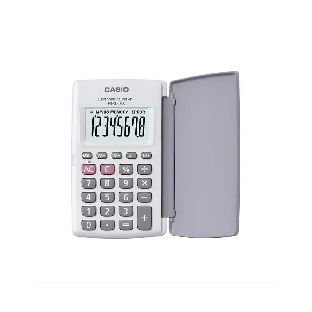 Casio HL-820LV con tapa protectora, pantalla de 8 dígitos y función de porcentaje. Ideal para oficina, estudio o uso personal.