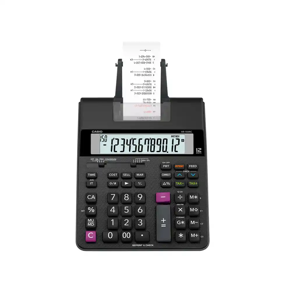Casio HR-150RC con impresión a 2 colores, pantalla de 12 dígitos y funciones contables. Precisión y durabilidad en cada cálculo.