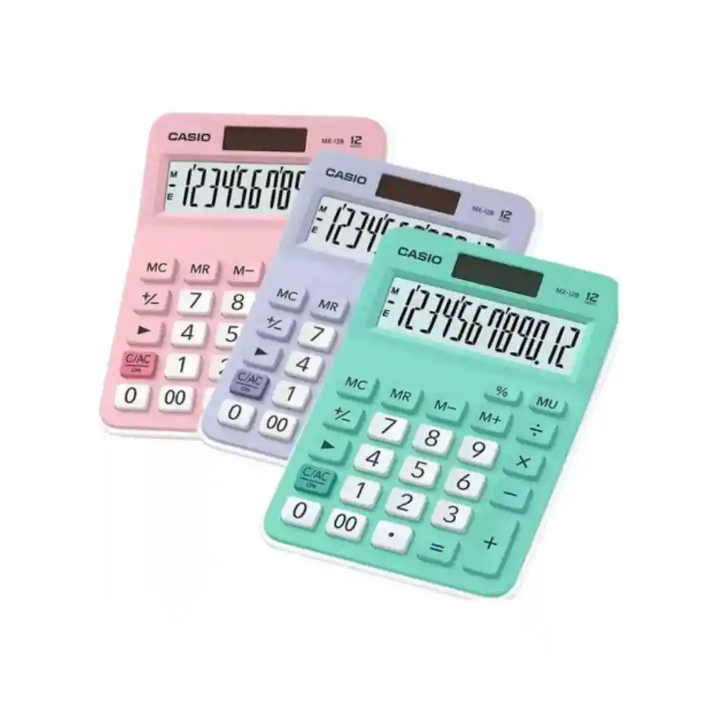 Casio MX-12B con pantalla grande de 12 dígitos, doble alimentación y tecla MU. Disponible en colores negro, lila, rosado, blanco y aguamarina.