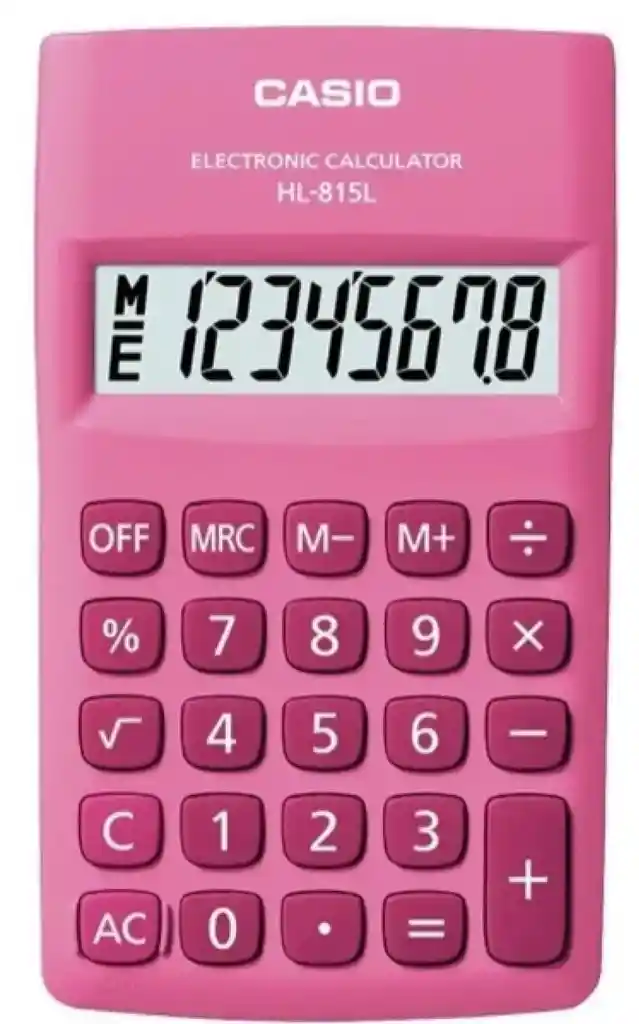 La Calculadora Casio HL-815L Rosado es una calculadora portátil, liviana y práctica, ideal para llevar a cualquier lugar. Su diseño compacto y su color rosado moderno la convierten en una excelente opción para estudiantes, oficina y uso doméstico, combinando funcionalidad y estilo. Características: Pantalla clara de 8 dígitos Funciones básicas: suma, resta, multiplicación y división Diseño portable y liviano Teclas suaves y cómodas Funcionamiento a batería Bajo consumo de energía Color rosado elegante Marca Casio, reconocida por su calidad y durabilidad Ideal para: estudiantes, oficina, comercio, hogar y cálculos rápidos en cualquier lugar. 🎨 Color: Rosado