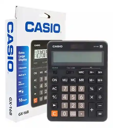 Calculadora casio de escritorio Gx16B solar original Tipo de escritorio DIGIT 16 dígitos Regular percent Porcentaje regular Cálculos de porcentaje regular. Two-way power Solar + Pila Energía solar cuando hay suficiente luz , por pila cuando la luz es insuficiente. Pulsación simultánea de teclas Las operaciones se almacenan en un búfer, así nada se pierde ni durante los ingresos de alta velocidad. MEDIDAS: 34.3X159X207.5mm PESO 245G ALIMENTACION SOLAR Y PILA 2 MEMORIAS