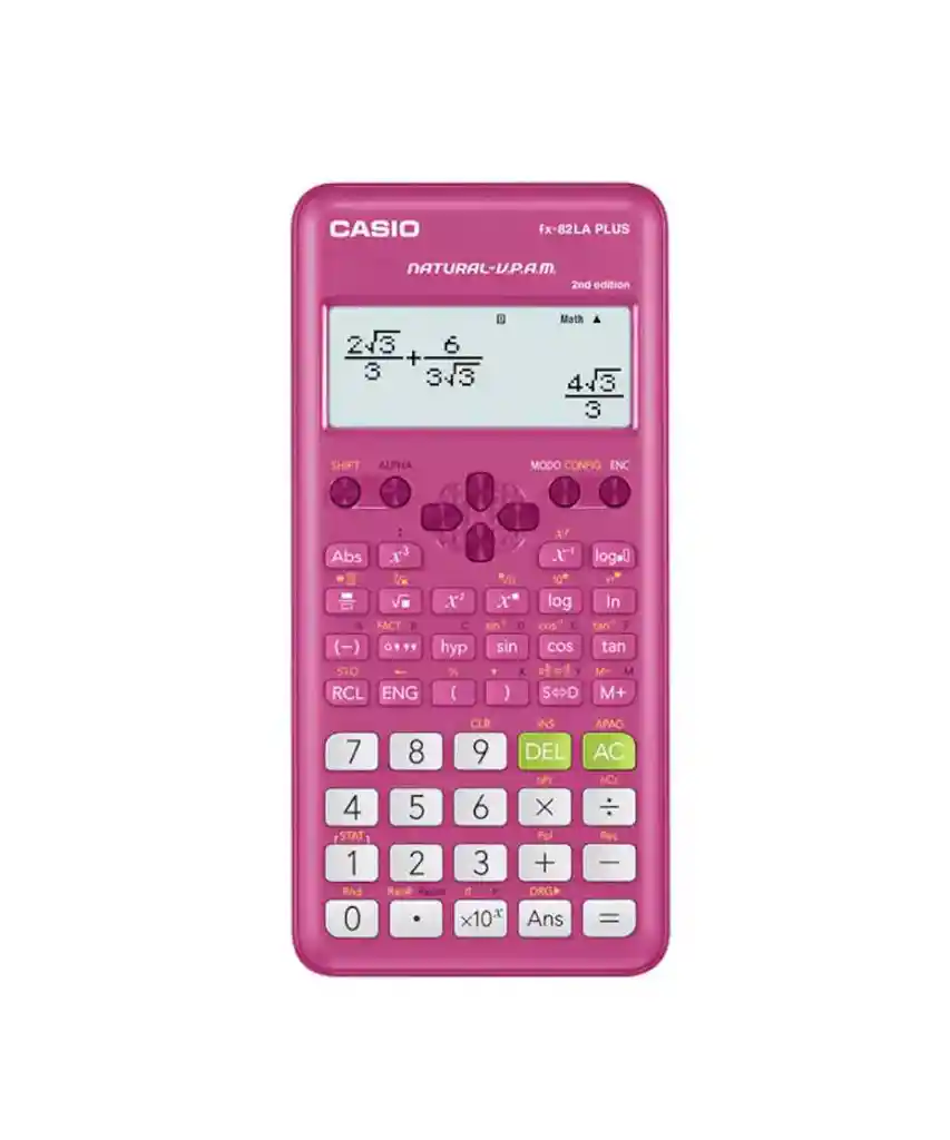 TENEMOS PUNTO FISICO EN LA CIUDAD DE CALI FX-82LA PLUS 2 GENERACION La serie LA PLUS, en sus distintos modelos de calculadora científica, tiene una gran ventaja pues su pantalla cuenta con 4 líneas (llamada Natural V. P. A. M.) que muestra expresiones matemáticas como aparecen en los libros de texto evitando confusiones entre los estudiantes. Pues el lenguaje matemático a usar en clase es el que utilizarán en su calculadora. La FX-82LA PLUS 2 BK, está recomendada para la secundaria , que en ella se pueden realizar funciones trigonométricas, cálculos de fracción, combinación y permutación entre otras funciones más. FUNCIONES: 252 funciones Factorización prima Enteros aleatorios Funciones estándar Transformación de coordenadas Cálculo de potencias Trigonometría Cálculos fraccionarios Combinación y permutación 9 variables Estadísticas Función de tabla Estadísticas Función de tabla Editor de datos STAT Repetición múltiple de fórmulas ejecutadas recientemente 10 dígitos + exponente de 2 dígitos Pantalla de matriz de puntos Pila AAA x 1