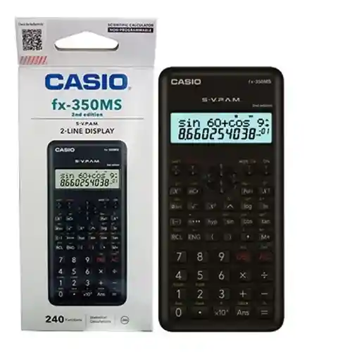 Descripción ARTICULO DISPONIBLE PARA ENTREGA INMEDIATA CALCULADORA CASIO FX 350 MS ORIGINAL NUEVA Características • Cálculos fraccionarios • Combinación y permutación • Estadísticas (editor de datos STAT, desviación estándar, análisis de regresión) • 9 variables • Viene con un estuche duro deslizable Especificaciones Batería: LR44 × 1 Cantidad de funciones: 240 10 + 2 dígitos: Visualización de mantisa de 10 dígitos + exponente de 2 dígitos. Presentación de matriz de puntos: Pantalla de alta resolución Porcentaje regular: Cálculos de porcentaje regular. Función de reproducción múltiple: Llamada rápida y fácil de las fórmulas ejecutadas previamente para la edición y repetición de ejecución. Teclas plásticas: Diseñadas y preparadas para ser de uso fácil. S-V.P.A.M. (Método algebraico con perfecta súper visualización): Ésta le brinda todas las características de la serie V.P.A.M. existente, más una nueva visualización de 2 líneas y una útil función de reproducción repetida. Todo esto hace que la matemática sea más fácil de aplicar y comprender que nunca antes. Editor de datos STAT: Edición y visualización en retroceso de los datos. Basic Statistics: Standard statistics functions such as Mean, SUM, Standard Deviation, and Regression Tamaño de la caja/peso total • Dimensiones (Pr. × An. × Al.) : 155×85×12mm • Peso : 100g