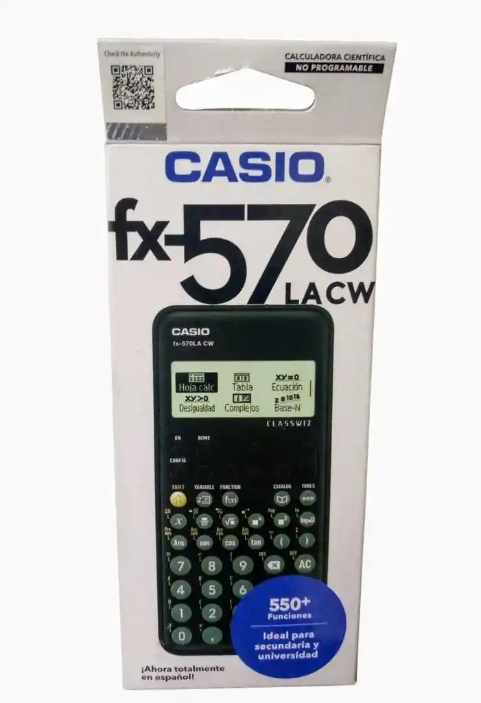 Calculadora Científica CASIO FX-570LA CW ClassWiz * Características principales: ✅ Más de 550 funciones para matemáticas, estadísticas, física, química e ingeniería. ✅ Hoja de cálculo integrada. ✅ Resolución de ecuaciones y desigualdades. ✅ Operaciones con números complejos y conversión de bases numéricas. ✅ Pantalla de alta resolución para una mejor visualización. ✅ Totalmente en español, fácil de usar. ✅ Ideal para secundaria y universidad. * Ventajas: No programable, aprobada para la mayoría de exámenes. Compacta, ligera y resistente. Tecnología ClassWiz para cálculos rápidos y precisos. Interfaz intuitiva con menús organizados. * Incluye: Calculadora Casio fx-570LA CW Manual en español Tapa protectora * Ideal para: Estudiantes de secundaria, bachillerato y universidad que requieren una herramienta confiable para resolver problemas científicos y técnicos.