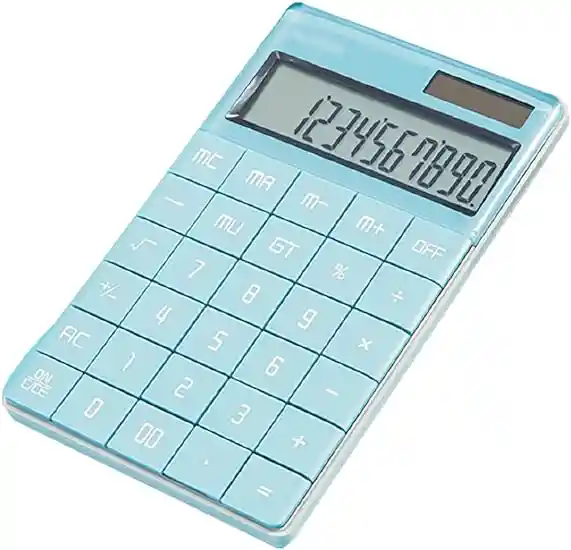 Calculadora Q5 marca Eates 12 dígitos de moderno diseño plano en lindo tono azul pastel de teclas planas y tecleado suave con soporte para levantar en ángulo la calculadora. Fácil de llevar, las medidas son 16.5 cm de alto x 10 cm de ancho