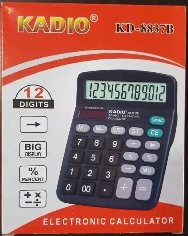 📊 Calculadora Kadio KD‑8837B – 12 Dígitos ✨ La compañera ideal para oficinas, estudiantes y profesionales que buscan precisión y confianza en cada cálculo. ✅ Características destacadas: Pantalla de 12 dígitos con números grandes y fáciles de leer, ideal para sumarios y presupuestos Operaciones aritméticas básicas (suma, resta, multiplicación, división), más cálculo de porcentaje Funciones útiles: memoria (M+, M‑, MR, MC), tecla doble cero, cambio de signo, retroceso y gran total Alimentación dual: pila AA (No incluida) Apagado automático para ahorro de energía Diseño compacto con teclas grandes y ángulo de pantalla ergonómico Construcción en plástico ABS resistente, con estilo moderno en tonos metálicos o negro