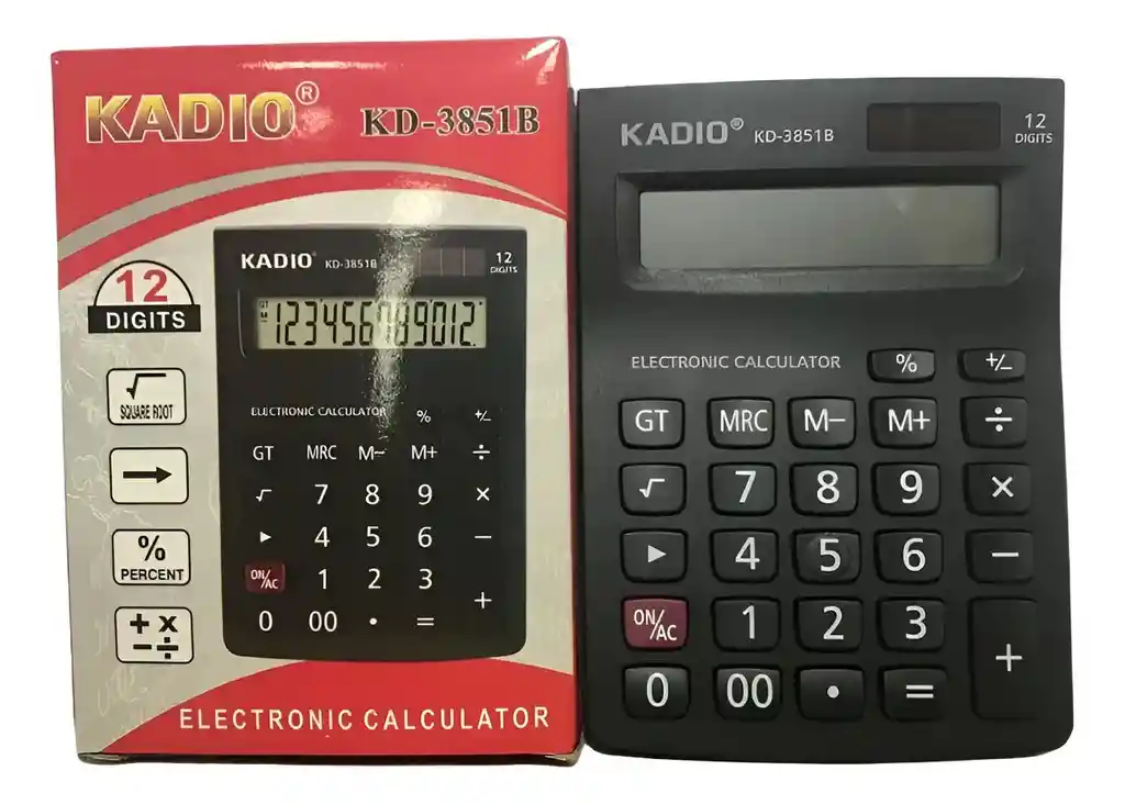 🧮 Calculadora Kadio KD‑3851B – 12 Dígitos Funciones Aritméticas Ideal para el día a día en la oficina, el hogar o la escuela, esta calculadora combina simplicidad y funcionalidad en un diseño compacto y eficiente. ✅ Características principales: Pantalla amplia de 12 dígitos, perfecta para visualizar grandes operaciones 👁️ Realiza funciones aritméticas básicas: suma, resta, multiplicación y división ➕➖✖️➗ Funciones adicionales: porcentaje (%), doble cero (00), cambio de signo (±), memoria (M+, M-, MR, MC) 🧠 Teclado grande y cómodo, con botones suaves y sensibles al tacto 🎯 Función de apagado automático para ahorrar energía ⏱️ Diseño liviano, práctico y duradero 📦