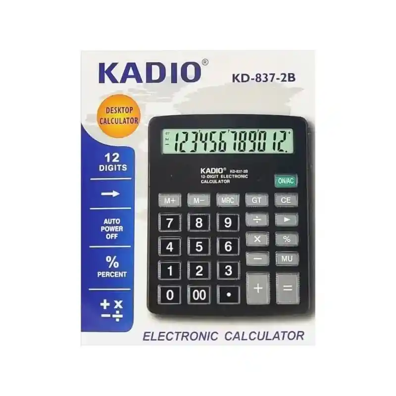 🧮 Calculadora Kadio KD-837-2B Haz tus cálculos diarios de forma práctica y rápida con esta calculadora de escritorio de diseño moderno y fácil de usar. Ideal para oficina, estudio o el hogar. ✅ Características clave: 🖥️ Pantalla de 12 dígitos, clara y fácil de leer 🔲 Teclas grandes y cómodas para uso frecuente ⚙️ Funciones básicas: suma ➕, resta ➖, multiplicación ✖️, división ➗, porcentaje % y memoria 📝 🏠 Perfecta para escritorio en oficina o estudio 🔋 Funciona con 1 pila AAA (no incluida) 🖤 Color negro con acabado resistente y elegante