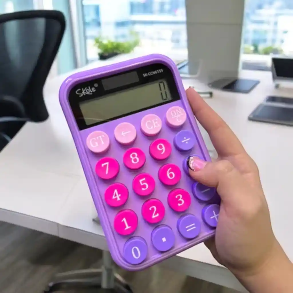 Morado con botones rosados y lilas Realiza operaciones aritméticas básicas Adecuada para oficina, escuela o uso doméstico
