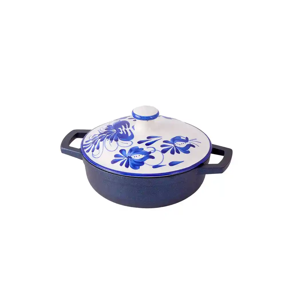 Elaborado en aluminio fundido resistente. Tapa de cerámica azul hecha a mano. Diseño artesanal de El Carmen de Viboral. Antiadherente interior: nada se pega. Antiadherente exterior fácil de limpiar. Base antideslizante para mayor estabilidad. Asas grandes para mejor agarre seguro. Ideal para cocinar y servir en mesa. Conserva mejor el calor en tus preparaciones. Cocción uniforme para mejores resultados. Diseño elegante y tradicional colombiano. Alta durabilidad para uso diario. Fácil limpieza y mantenimiento. La imagen ha sido ambientada; no incluye accesorios adicionales y el color puede variar según la iluminación.
