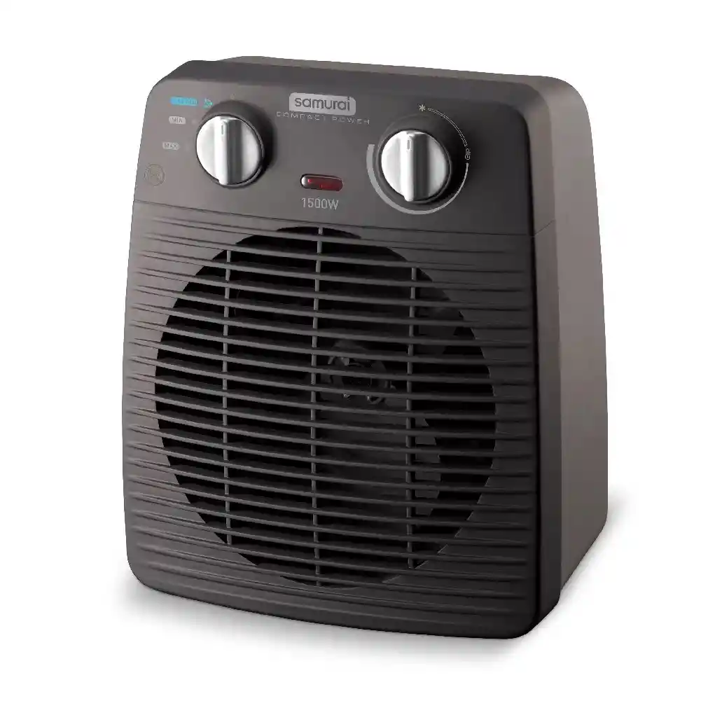 ¡Ahora no tendrás que aguantar frío en tu oficina o habitación! SAMURAI te presenta este práctico, cómodo y potente Calefactor Compact Power de dos velocidades, que te permitirá disfrutar de ambientes más cálidos gracias a sus dos velocidades, que además, incluye una función de ventilación para refrescar aún más. ¡Es perfecto para ti! Llévalo a tu hogar ahora mismo. Calefactor ¡COMPACTO Y POTENTE! Con uso adaptable a múltiples lugares 2 Velocidades + función de aire frío y con temperatura ajustable. Gracias a su tamaño compacto es fácil de transportar y se adapta a cualquier espacio del hogar. Escoge entre el nivel minimo (750W), para un uso discreto y prolongado, o el máximo (1500W), si buscas un calentamiento rápido y potente.