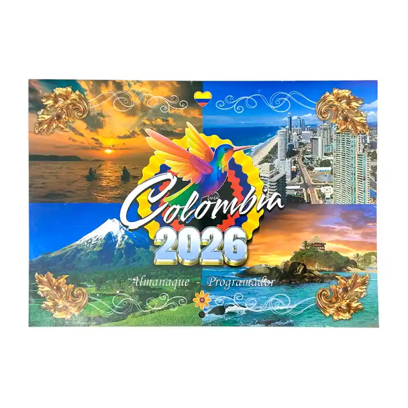 Calendario Colombia Fotográfico 2026 Incluye: 1 unidad Formato: Horizontal Tipo de calendario: Pared Medidas: 24 cm x 34 cm Características: - Diseño fotográfico con imágenes representativas de los paisajes, ciudades y destinos más emblemáticos de Colombia. - Cada mes presenta una fotografía diferente que resalta la riqueza natural, cultural y arquitectónica del país. - Incluye festivos y fechas destacadas del calendario colombiano. Uso recomendado: Ideal para el hogar, oficina, negocio o como regalo especial para amantes de Colombia, el turismo y la fotografía.