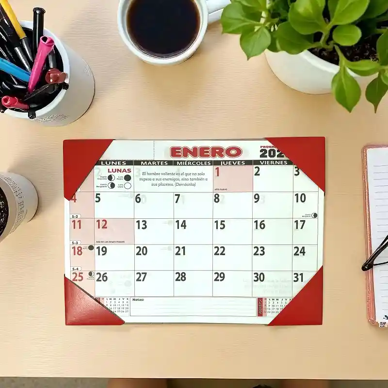 Calendario Programador 2026 Diseño: Protector de Puntas Formato: Horizontal Tamaño: Mediano Medidas: Alto 24 cm x Ancho 34 cm Color: Rojo - Una herramienta indispensable para mantenerte al tanto de tus tareas y eventos importantes. - Amplio espacio para planificar, anotar y visualizar tus compromisos con claridad. - Ideal para oficinas, estudios o cualquier espacio donde la organización sea clave.
