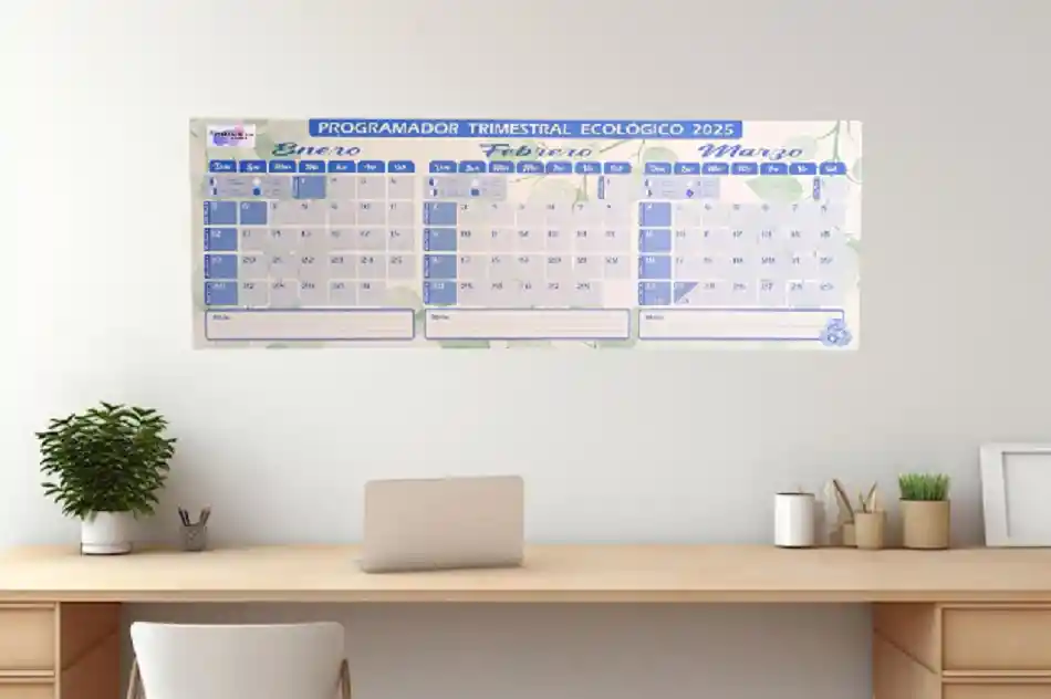 Calendario Programador Trimestral Ecológico 2025 Incluye: 1 programador trimestral con 4 hojas (1 hoja por trimestre), diseñado para cubrir los 12 meses del año. Medidas: 69 cm x 24 cm Características principales: - Diseñado para ayudarte a planificar tus metas, tareas y eventos importantes en un solo vistazo. - Diseño trimestral: Cada hoja abarca un trimestre completo, brindándote una visión clara de tus próximos 3 meses. Ideal para planificar proyectos a corto y mediano plazo. - Formato práctico: Perfecto para colgar en tu oficina, sala de estudio o cualquier espacio de trabajo. - Material ecológico: Contribuye al cuidado del medio ambiente, ya que está elaborado con materiales sostenibles. - Adhesivo incluido: Cada hoja cuenta con adhesivo en las esquinas para que puedas fijarlo donde lo necesites.