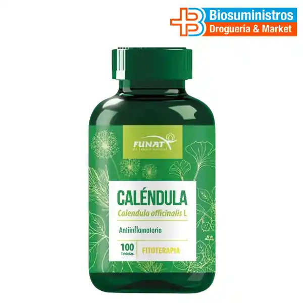 Caléndula 100 tabletas Funat. Composición: Cada tableta contiene: Caléndula (Caléndula officinalis L flores secas) 500 mg. Excipientes c.s.p….1 Tableta. Dosis recomendada: 1 Tableta 3 veces al día. Uso aprobado: Antiinflamatorio.