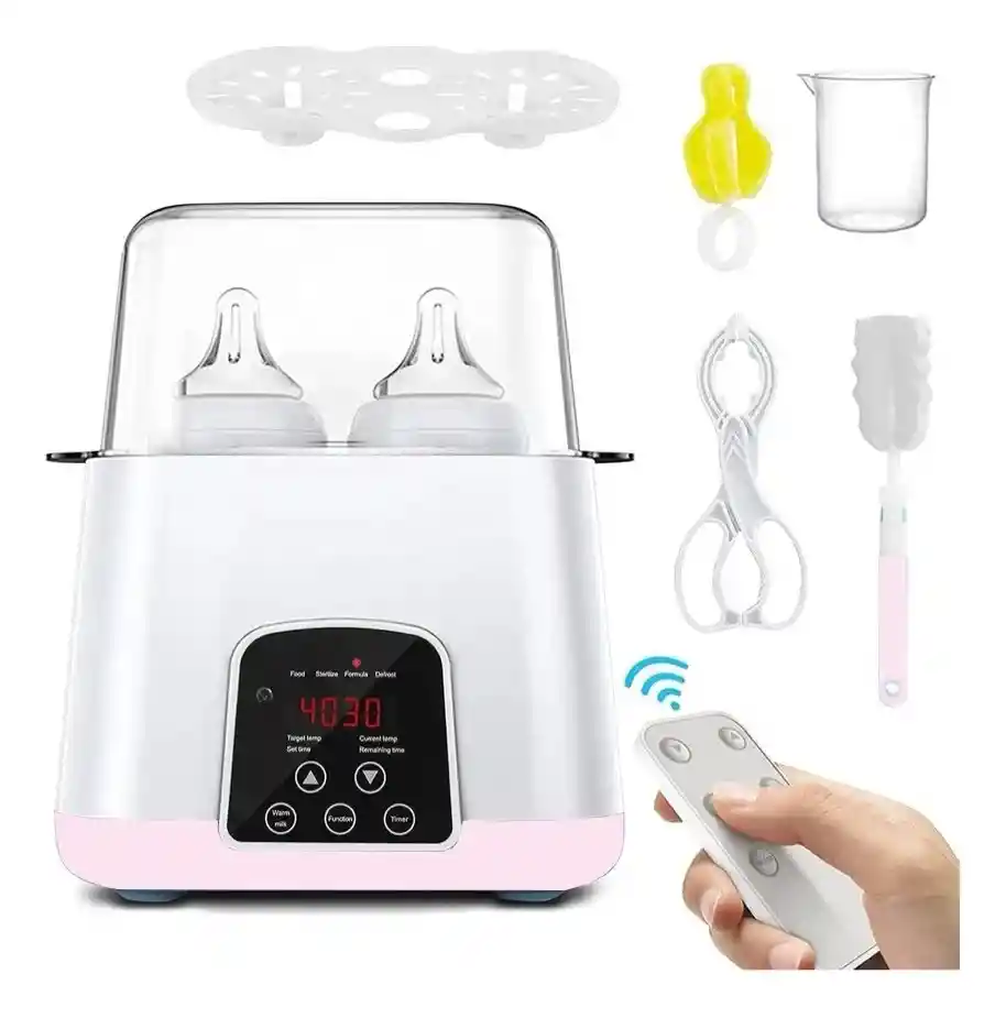 Este dispositivo multifuncional es la solución perfecta para padres que buscan practicidad y seguridad. Gracias a su tecnología avanzada, puedes calentar leche, preparar fórmula, esterilizar, calentar alimentos, descongelar y mantener la temperatura ideal de manera rápida y uniforme. Su pantalla LCD táctil permite un control preciso de temperatura y tiempo, mientras que su sistema de protección contra sobrecalentamiento garantiza un uso seguro en todo momento. Además, su diseño espacioso permite calentar hasta dos biberones al mismo tiempo, ideal para alimentar a gemelos o a más de un bebé. ~ CARACTERÍSTICAS Multifuncional 6 en 1: Calienta leche, fórmula, esteriliza, calienta alimentos, descongela y mantiene la temperatura. Material seguro y libre de BPA: Fabricado en PP de grado alimenticio, resistente a altas temperaturas y sin sustancias tóxicas. Capacidad para dos biberones: Perfecto para gemelos o más bebés, compatible con la mayoría de biberones del mercado. Pantalla LCD y control táctil Protección contra sobrecalentamiento: Desconexión automática para mayor seguridad. Termostato inteligente: Mantiene la leche y los alimentos a temperatura constante durante 24 horas. Esterilización con vapor: Mata hasta el 99.9% de las bacterias a 100oC , protegiendo a tu bebé de gérmenes. Bajo nivel de ruido: Funciona silenciosamente sin interrumpir el descanso del bebé. ~ QUÉ TE INCLUYE 1 Esterilizador y Calentador de Biberones 6 en 1 de 52 Bits. 1 Base con pantalla LCD táctil. Accesorios para esterilización y calentamiento. Manual de usuario.