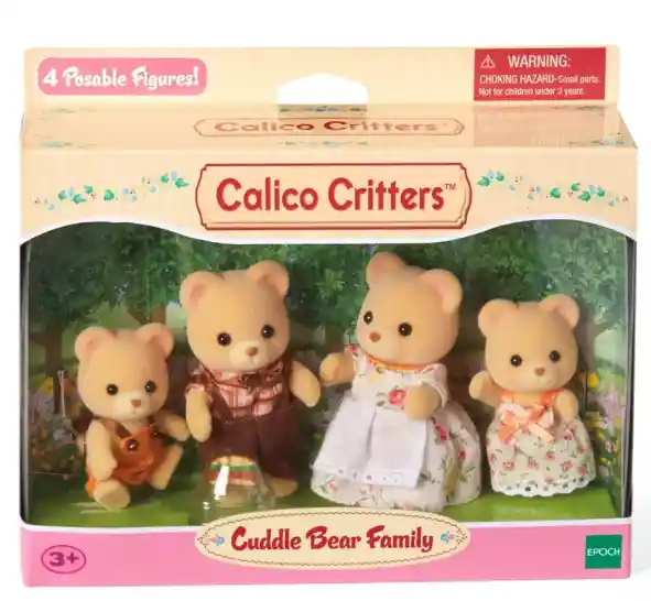 Figuras coleccionables y articuladas de osos Cuddle. Juego de 4 piezas: Padre, madre, hermano y hermana. Vestidos con ropa de tela que se puede quitar. Estimula el juego de rol imaginativo de los niños. Este juego es apto para niños y niñas mayores de tres años. oso| familia | Calico Critters | juguete | tierno | colección | creativo | exclusivo | miniatura | imaginativo
