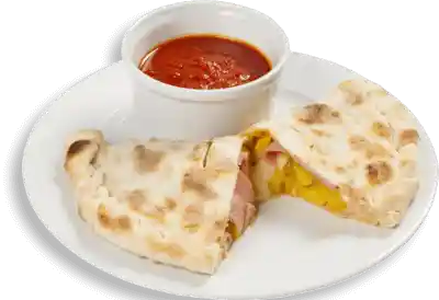 Calzone con base napolitana, queso mozzarella, jamón y piña.