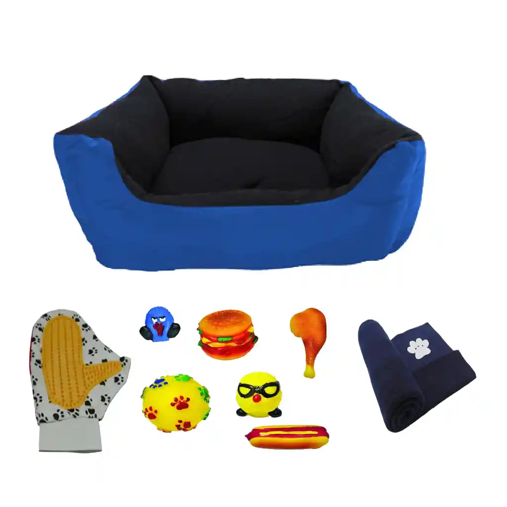 Lleva una Cama Gigante para darle un súper descanso a tu mascota. Elaborada con relleno supersuave de fibra Siliconada, material suave y fresco, ideal para darle un cómodo y suave descanso a tu mascota, recomendado para para perros grandes cuenta con bumpers para que apoye su cabeza donde quiera. Características: -Medidas: Medidas externas Ancho 76 cm, Largo 95 Cm, Alto 24 Cm Medidas en el área para dormir Ancho 46 cm, Largo 64 cm, Alto 24 cm Medidas del cojín, Ancho 65 cm, Largo 80 cm, Alto 15 cm -Cojín extraíble cuenta con una cremallera con el fin de retirar el relleno y facilitar el lavado. -Cama y cojín con relleno en fibra siliconada suave. Elije tu favorita más de 10 Colores, siempre disponibles Se puede en lavadora ciclos de lavado delicados o suaves colocando la cama dentro de una funda secando en fondo de la lavadora o secadora directamente después del lavado. Lleva 1 Cobija térmica Grande para mascota con lindo estampado de huella. Elaborada en tela térmica con alto grado de suavidad, cuenta con los bordes fileteados para que esta no pierda su forma al pasar el tiempo, Adicional mente se puede utilizar complemento o cobija en la cama de tu mascota, gracias a la tela estas cobijas brindan calor y comodidad Tiene una gran superficie de uso Aproximadamente 70 Cm x 120 Cm. Elige el color que más te guste entre más de 10 Colores. Se puede en lavadora ciclos de lavado delicados o suaves colocando la cama dentro de una funda secando en fondo de la lavadora o secadora directamente después del lavado. GUANTE CEPILLO PARA PERROS Y/O GATOS El cepillado es la base fundamental para el cuidado del pelaje canino, si lo haces frecuentemente eliminarás hasta el 50% de la suciedad y el pelo muerto de tu perro, dos factores que con frecuencia son los generadores de nudos y los molestos pelos por toda la casa. Lo mejor para las mascotas es usar un "Guante Plástico" o cepillos con cerdas plásticas, los cuales arrastran el pelo muerto sin maltratar la piel, reduciendo considerablemente la cantidad de pelo que tu mascota deja en el sofá, piso, cama y en tu ropa. Juguete Grande: Juguete Plástico GRANDE surtidos con pito. Estos juguetes plásticos con forma son ideales morder, gracias a su tamaño y flexibilidad proporciona entretenimiento y diversión para el amo y su mascota al mismo tiempo que fortalece dientes y mandíbulas Tener en cuenta Las imágenes son referencia para conocer el producto, al momento de despachar se hace de manera aleatoria teniendo cuidado de no repetir el mismo juguete