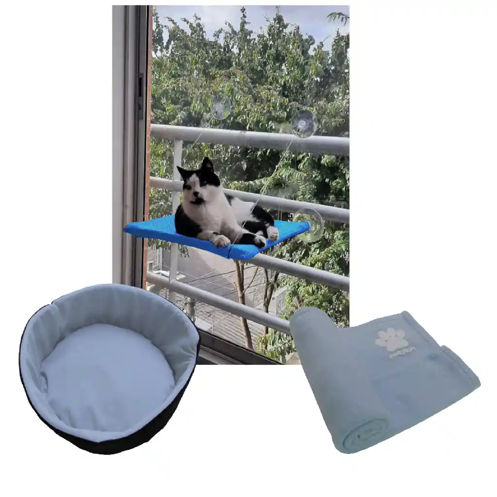 Bienvenido somos HallyPet, tu mejor aliado para el cuidado de tu hijo Perruno y/o Gatuno. Realizamos despachos a nivel nacional todos los días a la 1 pm, si es para Bogotá entregamos el mismo día, las compras realizada después de esa hora se despachan al día siguiente. CAMA HAMACA PARA GATOS La mejor cama para gatos cómoda para tu gato, a nuestro gato le encantará jugar y dormir en ella. La cama para la ventana es práctica, ocupa poco espacio y se coloca en pocos segundos, quedando completamente horizontal. Características del producto: • Dimensiones: ancho de 40 cm, fondo 38 cm, alto 3 cm. • Forma cuadrada • Pesos aproximadamente de 18 kilos. • La Cubierta Inferior es elaborada en material resistente. • Cuenta con 4 Ventosas para pegar al vidrio de la ventana (Solo debes de limpiarla con Agua y jabón antes de usar. • La hamaca es adecuada para tomar el sol de tu gato. • Ocupa poco espacio. • Adecuada para dormir o asiento de descanso de tu mascota. Lleva : Una Cama doble faz para darle un súper descanso a tu Gato La cama redonda doble faz para gatos es ideal para que un gato descanse cómodamente, esta elaborada en tela fleece adicionalmente en su base cuenta con un relleno siliconado supersuave Medidas diámetro 47 Cm, Alto 19 Cm Lleva 1 Cobija térmica Grande para mascota con lindo estampado de huella. Elaborada en tela térmica con alto grado de suavidad, cuenta con los bordes fileteados para que esta no pierda su forma al pasar el tiempo, Adicional mente se puede utilizar complemento o cobija en la cama de tu mascota, gracias a la tela estas cobijas brindan calor y comodidad Tiene una gran superficie de uso Aproximadamente 70 Cm x 120 Cm.