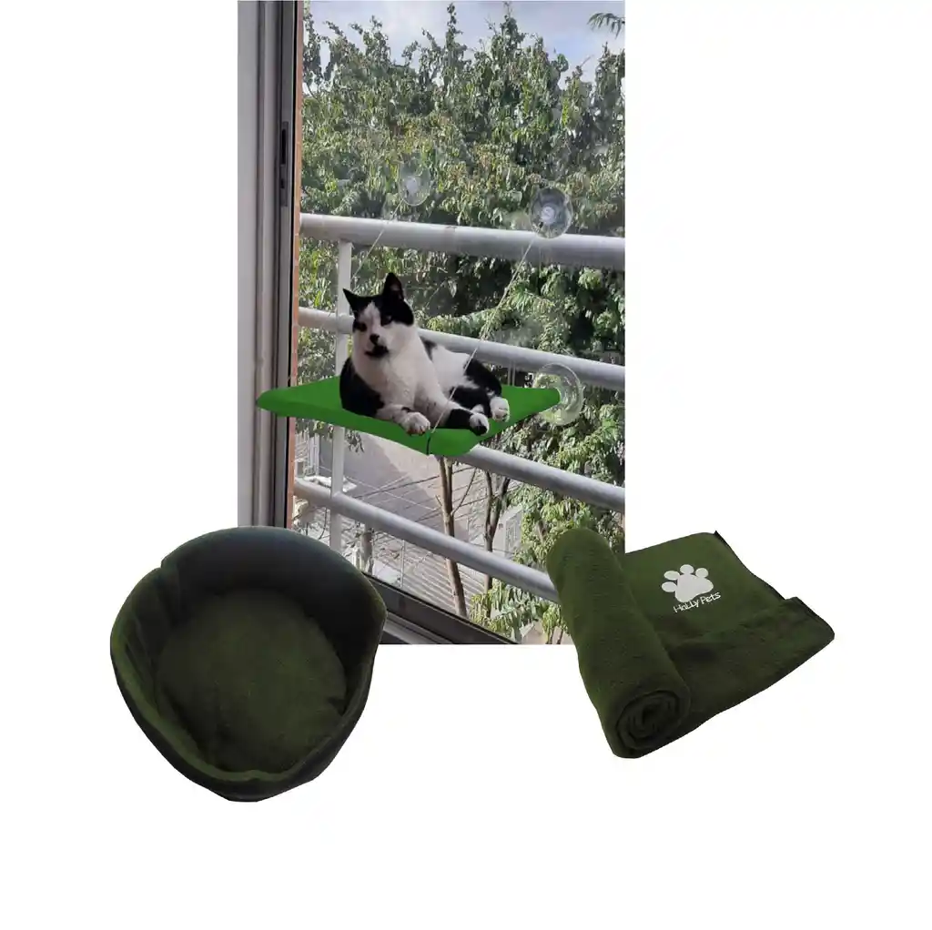 Bienvenido somos HallyPet, tu mejor aliado para el cuidado de tu hijo Perruno y/o Gatuno. Realizamos despachos a nivel nacional todos los días a la 1 pm, si es para Bogotá entregamos el mismo día, las compras realizada después de esa hora se despachan al día siguiente. CAMA HAMACA PARA GATOS La mejor cama para gatos cómoda para tu gato, a nuestro gato le encantará jugar y dormir en ella. La cama para la ventana es práctica, ocupa poco espacio y se coloca en pocos segundos, quedando completamente horizontal. Características del producto: • Dimensiones: ancho de 40 cm, fondo 38 cm, alto 3 cm. • Forma cuadrada • Pesos aproximadamente de 18 kilos. • La Cubierta Inferior es elaborada en material resistente. • Cuenta con 4 Ventosas para pegar al vidrio de la ventana (Solo debes de limpiarla con Agua y jabón antes de usar. • La hamaca es adecuada para tomar el sol de tu gato. • Ocupa poco espacio. • Adecuada para dormir o asiento de descanso de tu mascota. Lleva : Una Cama doble faz para darle un súper descanso a tu Gato La cama redonda doble faz para gatos es ideal para que un gato descanse cómodamente, esta elaborada en tela fleece adicionalmente en su base cuenta con un relleno siliconado supersuave Medidas diámetro 47 Cm, Alto 19 Cm Lleva 1 Cobija térmica Grande para mascota con lindo estampado de huella. Elaborada en tela térmica con alto grado de suavidad, cuenta con los bordes fileteados para que esta no pierda su forma al pasar el tiempo, Adicional mente se puede utilizar complemento o cobija en la cama de tu mascota, gracias a la tela estas cobijas brindan calor y comodidad Tiene una gran superficie de uso Aproximadamente 70 Cm x 120 Cm.