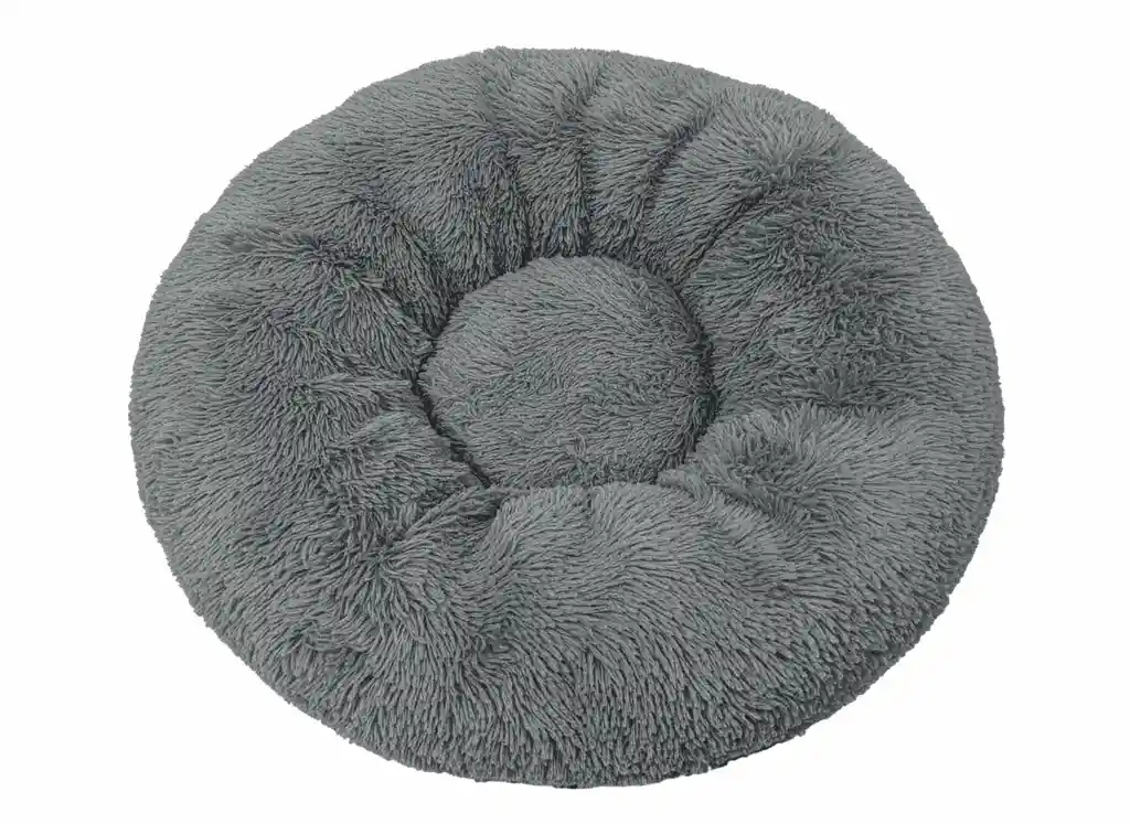 50 cm diámetro aprox, tela peluche (afelpada larga), fondo antideslizante y resistente al agua, rellena de espuma siliconada, cama lavable cómoda para perros y gatos. Color gris.