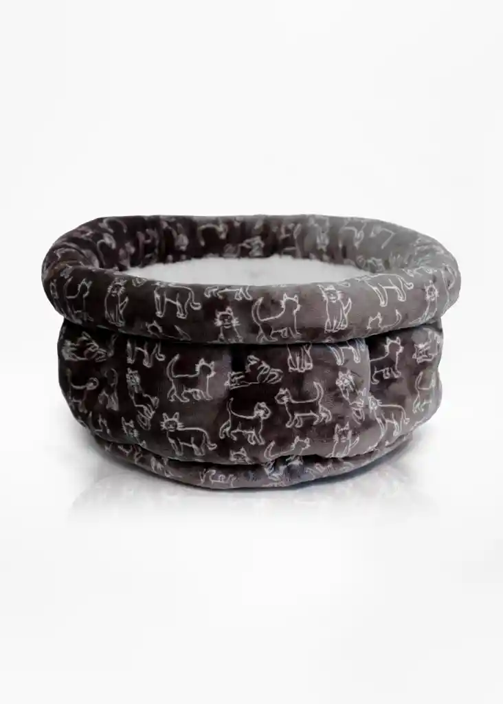 Cama redonda para gato, acolchada y suave. Tiene un diseño exterior gris con dibujos blancos de perritos y un interior blanco tipo borrega, ideal para brindar calidez y comodidad. Perfecta para gatos pequeños que disfrutan sentirse envueltos al descansar.