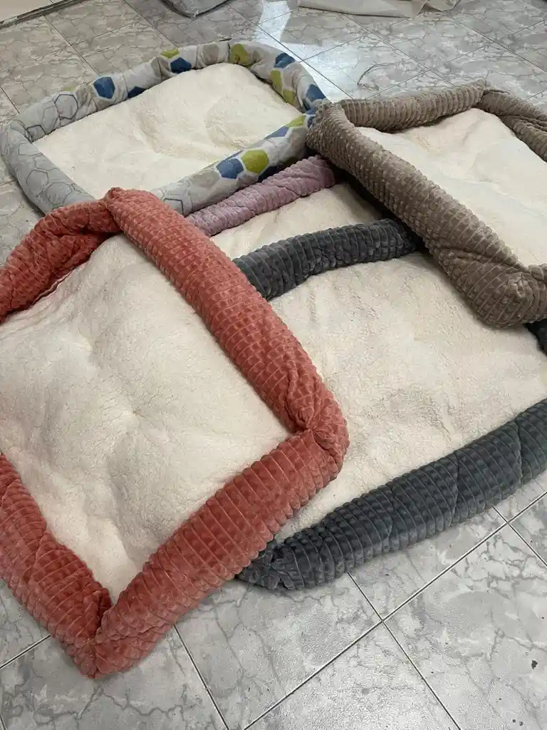 Cama elaborada en sherpa y piel de durazno, variedad de colores, rellena de algodón, siliconado
