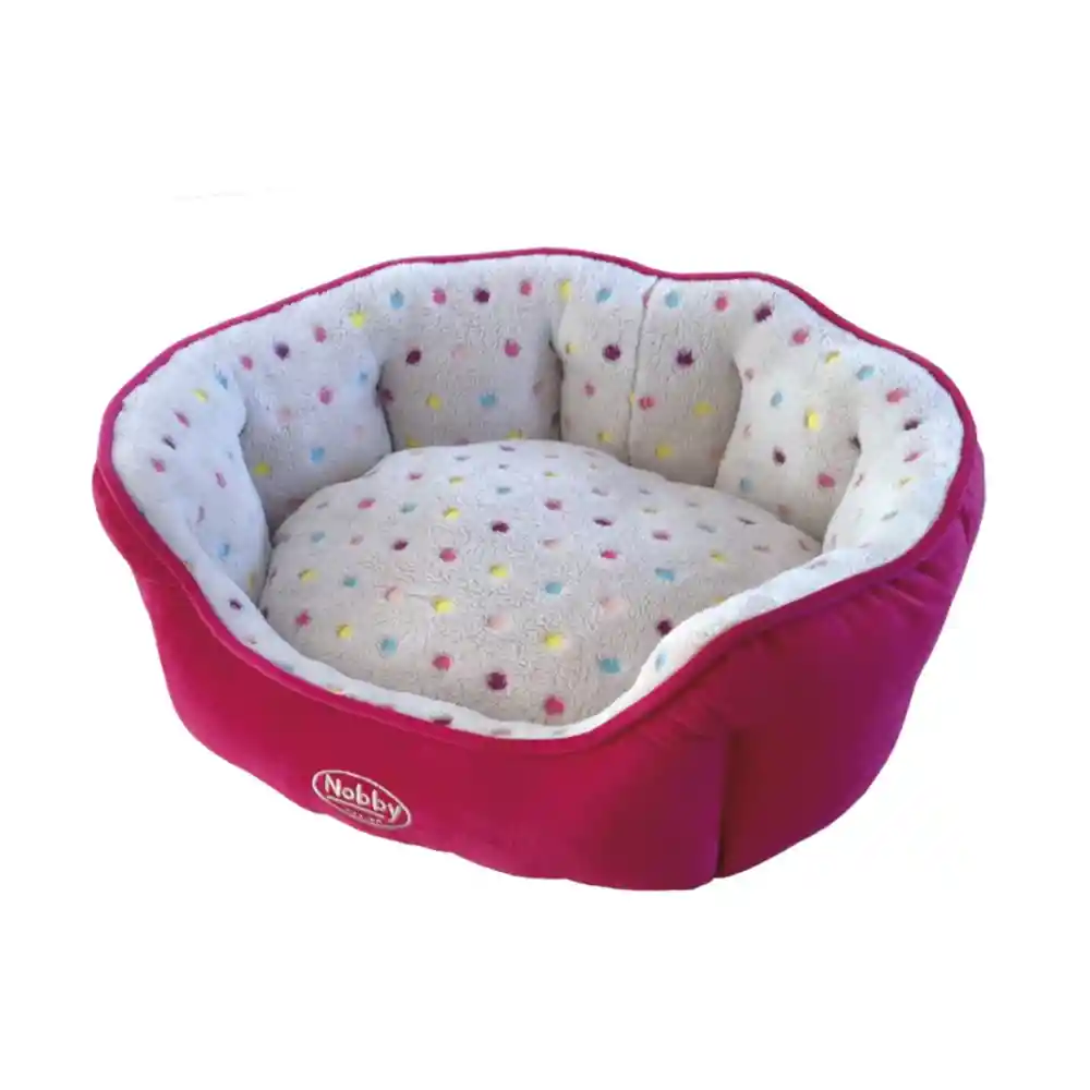 Cama en forma de nido y decoración de ponqué rosado. Ideal para perros pequeños y gatos. Tamaño 65 x 57 cm.