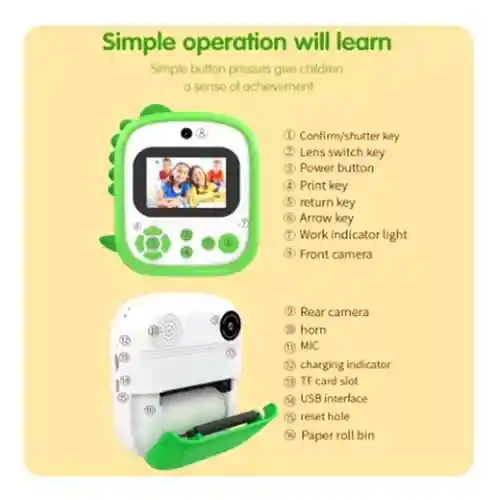 Impresión instantánea de alta resolución: la impresora fotográfica térmica P3 le permite imprimir instantáneamente fotografías de alta calidad con una resolución de 1080P. ture momentos preciosos y téngalos en sus manos en cuestión de segundos. Con tecnología de impresora térmica que no requiere tóner y papel de impresión amigable con la piel y fácil de reemplazar. de cámara dual con pantalla clara: Equa con un de cámara dual delantera y trasera de 1200W, esta cámara instantánea para niños le permite turar fotografías impresionantes con facilidad. Pantalla IPS de 2,4" que proporciona una visualización clara y vibrante para facilitar la composición y revisión de las fotografías. Obtenga una vista previa de sus fotografías antes de imprimirlas y asegúrese de obtener la toma perfecta en todo momento. Marcos y filtros personalizables: con 28 marcos de fotos diferentes y 6 filtros únicos para elegir, puedes agregar un toque personal a tus fotos. Crea impresiones divertidas y creativas que se destaquen entre la multitud. Batería de larga duración: compatible con tarjetas de alenamiento de hasta 32 GB, puede turar y alenar innumerables recuerdos. Y gracias a su batería de litio incorporada, la cámara P3 se puede cargar completamente en solo 1 o 2 horas y proporciona hasta 4 a 5 horas de uso continuo. Deje que los niños puedan llevarlo a sus aventuras sin preocuparse por quedarse sin energía. Regalo ideal: un regalo perfecto para el cumpleaños, Navidad, Acción de Gracias o cualquier otra ocasión especial de su hijo. Es un juego divertido y sencillo con el que a su hijo le encantará jugar y que apreciará durante muchos años.