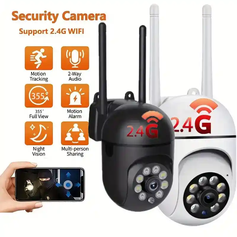 Cámara de Seguridad WiFi Inalámbrica 2.4G - CCTV Exterior de 2MP para el Hogar con Pan/Tilt de 360°, Audio Bidireccional, Detección de Movimiento y Visión Nocturna a Color - Compatible con la App Eseecloud