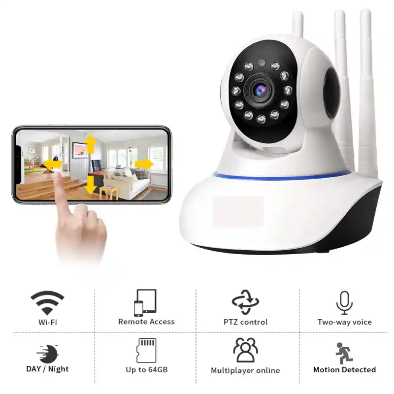 Camara de seguridad robotica 1080p visión nocturna + memoria micro sd 32 gb Descarga el vídeo de la micro SD desde la App al celular y visualizarlo en tu App, así podrás compartir tus vídeos locales a todas tus redes sociales Memoria micro SD de 32 Gb: Resguarda tu información en una Micro SD, al terminarse la capacidad, los vídeos anteriores serán sustituidos de forma automática. Resolución HD 1080p: 2 megapíxeles. Imágenes en FUL HD para percibir los mejores detalles posibles, tienes pruebas de vídeo en excelente calidad. / Triple antena ayudara a tener una mejor recepción Inalambrica Podras instalarla en bases planas, paredes o techo Visión nocturna (11 LED’S INFRARROJOS) Sin necesidad de luz, vea todo con total claridad en un rango de hasta 10 mts Dimensiones: 14x13x11cm Soporte Memoria: Hasta 64Gb (incluye micro SD 32Gb) Protocolo ONVIF: Si Sensor de imagen: CMOS Formato vídeo: AVI Lente: 3,6 mm Leds infrarrojos: 11 PCS Resolución: 1080P HD – 2Mpx Angulo de visión: 355° -120° PTZ: Horizontal 100,2 Vertical 74,7 Energía: DC 5V 2A WIFI: 20mts Interfaz de red: wifi/802.11/b/g Visión nocturna: 15mts Sensor de movimiento Lo que obtienes con tu compra 1 x Camara de seguridad 1 x Cable de poder 1 x Base para anclar a pared o techo 2 x Tornillos 2 x Chazos 1 x Micro SD 32 Gb 1 Manual De Instrucciones 90 Días de garantia por defectos de fabricación. -Recuerda que la vida útil de tu PRODUCTO depende directamente de su uso. Por esto mismo te recomendamos seguir todas las instrucciones que trae cada artículo al pie de la letra y leer el manual de GARANTÍA.