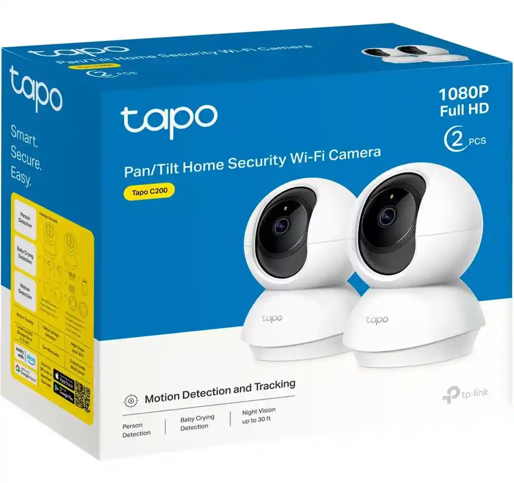 Vídeo de Alta Definición. Captura todos los detalles con una resolución 1080p. Visión panorámica. La cámara se mueve 360º horizontal y 114º vertical para grabar todos los detalles. Visión nocturna. Incluso de noche alcanza una distancia visual de hasta 9 metros. Seguimiento Inteligente de movimiento. Detecta y sigue con precisión a una persona dentro del campo de visión de la cámara. Alarma con luz y sonido. Al detectar movimientos sospechosos activa la alarma de luz y sonido para disuadir la amenaza. Sonido bidireccional. Permite la comunicación a través del micrófono y altavoz integrados en la cámara. Almacenamiento Seguro. Compatible con tarjeta MicroSD Card de hasta 512 GB. Protección de datos. Utiliza protocolos de cifrado avanzados para garantizar la privacidad de tus datos. Control por Voz. Compatible con Asistente de Google y Amazon Alexa. Solo disponibles en ciertos países e idiomas.