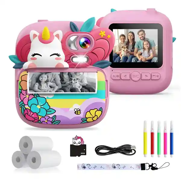 Equipada con cámara dual, filtros divertidos, juegos integrados y una pantalla grande, ofrece una experiencia intuitiva y emocionante que estimula la creatividad desde el primer uso. ¡Ideal para fiestas, viajes o simplemente jugar en casa! Regalo perfecto para niños curiosos y creativos. Fomenta la expresión artística y ahorra tiempo y dinero al no requerir tinta ni procesos complicados. ¡Solo toma, imprime y sonríe! Incluye todo lo que necesita para comenzar a crear: Cámara instantánea con pantalla y diseño infantil 3 rollos de papel térmico 5 plumones de colores para decorar las fotos Cable USB de carga Correa con diseño para llevarla con seguridad