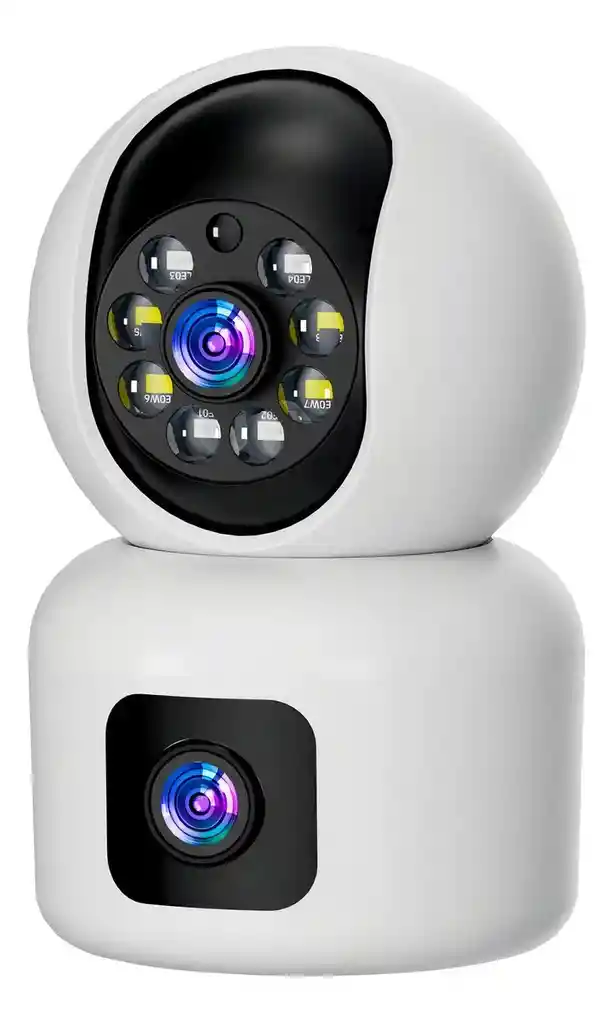 doble lente de pantalla dual v380 pro, 1 lente giratorio, 2 lente disparo fijo cada lente de 2mp, vision nocturna infrarrojo, micrófono y alta voz bidireccional, modo de privacidad, ranura para tarjeta micro sd, almacenamiento en la nube wifi 2.4ghz