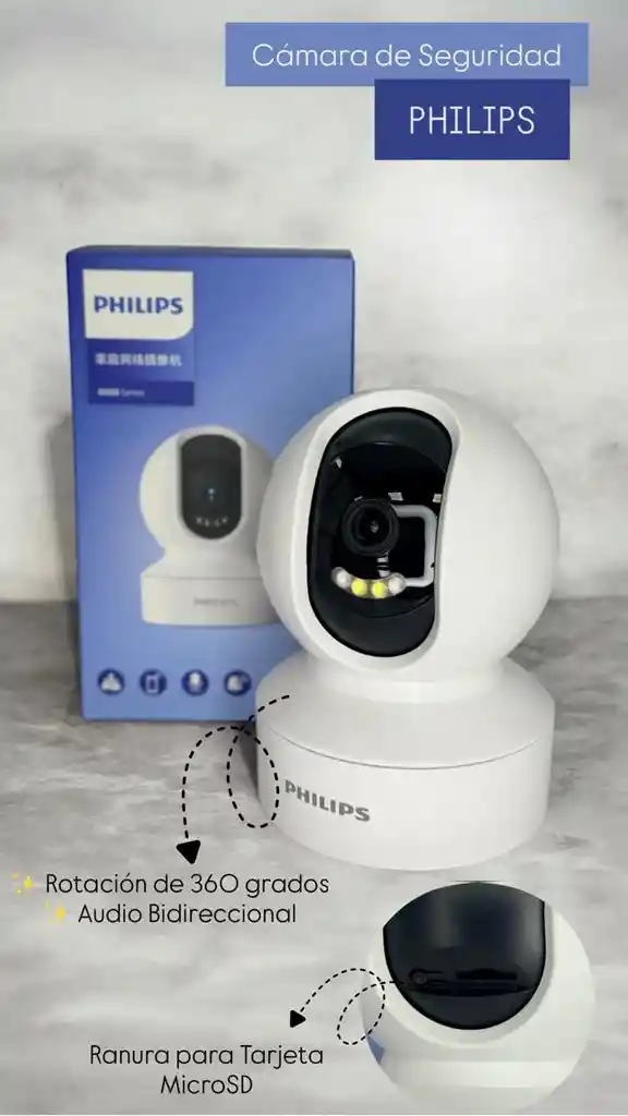 *Cámara de Seguridad PHILIPS* 🎥 - Monitoreo en tiempo real desde la aplicación Móvil - Comunicación bidireccional (micrófono y altavoz integrado) - Detección de movimiento - Visión nocturna - Conexión inalámbrica WiFi 🛜 - Instalación sencilla sobre superficie plana - Alimentación eléctrica por cable - *Aplicación: Philips Home Camera* - Ranura para tarjeta MicroSD
