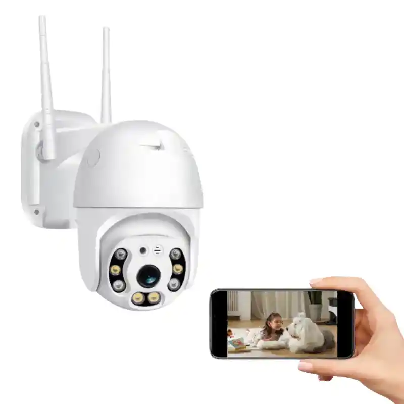 🔹 Descripción del producto La Cámara PTZ WiFi para exteriores es un sistema de videovigilancia inteligente con diseño tipo domo motorizado que permite giros horizontales y verticales (Pan, Tilt, Zoom). Con visión nocturna avanzada, audio bidireccional y certificación IP66, está preparada para ofrecer seguridad confiable en exteriores sin importar el clima. 🔹 Características Resolución Full HD 1080p (1920 × 1080 px) Giro horizontal 355° y vertical 90° con zoom digital 4x Conexión WiFi 2.4 GHz y puerto RJ45 para conexión por cable Visión nocturna: infrarroja hasta 30 m / a color hasta 20 m con LEDs blancos Audio bidireccional (micrófono y altavoz integrados) Detección de movimiento con alertas en tiempo real Ranura microSD hasta 128 GB + soporte para almacenamiento en la nube Resistencia IP66: apta para lluvia, polvo y variaciones de temperatura Instalación en pared o techo, material ABS reforzado 🔹 Beneficios para ti ✔ Cobertura completa sin puntos ciegos gracias a su función PTZ ✔ Seguridad 24/7 con visión nocturna a color o en blanco y negro ✔ Conectividad flexible: WiFi inalámbrico o cable de red ✔ Comunicación remota en tiempo real desde tu celular ✔ Resistente a condiciones exteriores con protección IP66 🔹 Modo de uso Instala la cámara en pared o techo con los accesorios incluidos. Conéctala a la fuente de alimentación DC 12 V. Descarga la app compatible en iOS o Android. Conéctala vía WiFi o cable RJ45. Configura almacenamiento local (microSD) o en la nube. Controla desde la app: giro PTZ, visión nocturna, grabaciones y alertas.